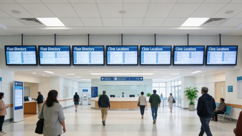 Outpatient clinics also rely on internal communication displays to support daily operations. Digital signage screens installed in staff-only areas help teams stay aligned without disrupting patient-facing spaces.
