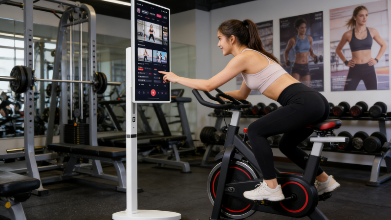 The adjustable stand allows the screen to be positioned comfortably during exercise.
